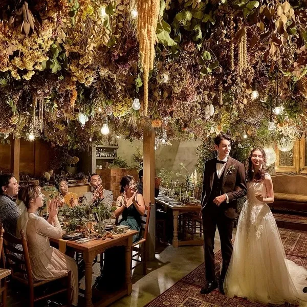 アンティークの扉を開けるとまるで絵本の中に入ったような世界観。贅沢にドライフラワーをたっぷり使った天井装飾は圧巻の迫力で、まるでお花のお姫様のような気分♪沢山写真を撮って思う存分楽しんで*